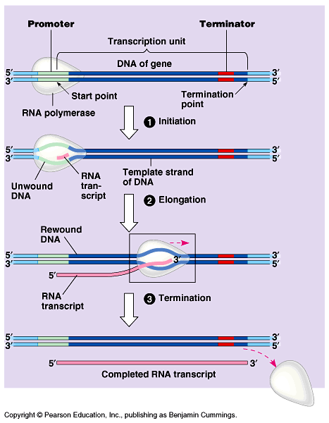 İlk aşamada çekirdekte bulunan DNA sarmalından mRNA yazılımı (transkripsyon) gerçekleşir. RNA genelde tek zincirlidir. DNA dan farklı olarak timin yerine urasil(U) ve deoksiriboz yerine riboz şekeri bulundurur. Üçlü mRNA kod grubunun (kodon) aminoasit dizine çevrimi ve protein üretimi (translasyon) ile gen ifadesi oluşur. DNA dan protein oluşturulan bu sürecinin tamamına santral dogma denir.